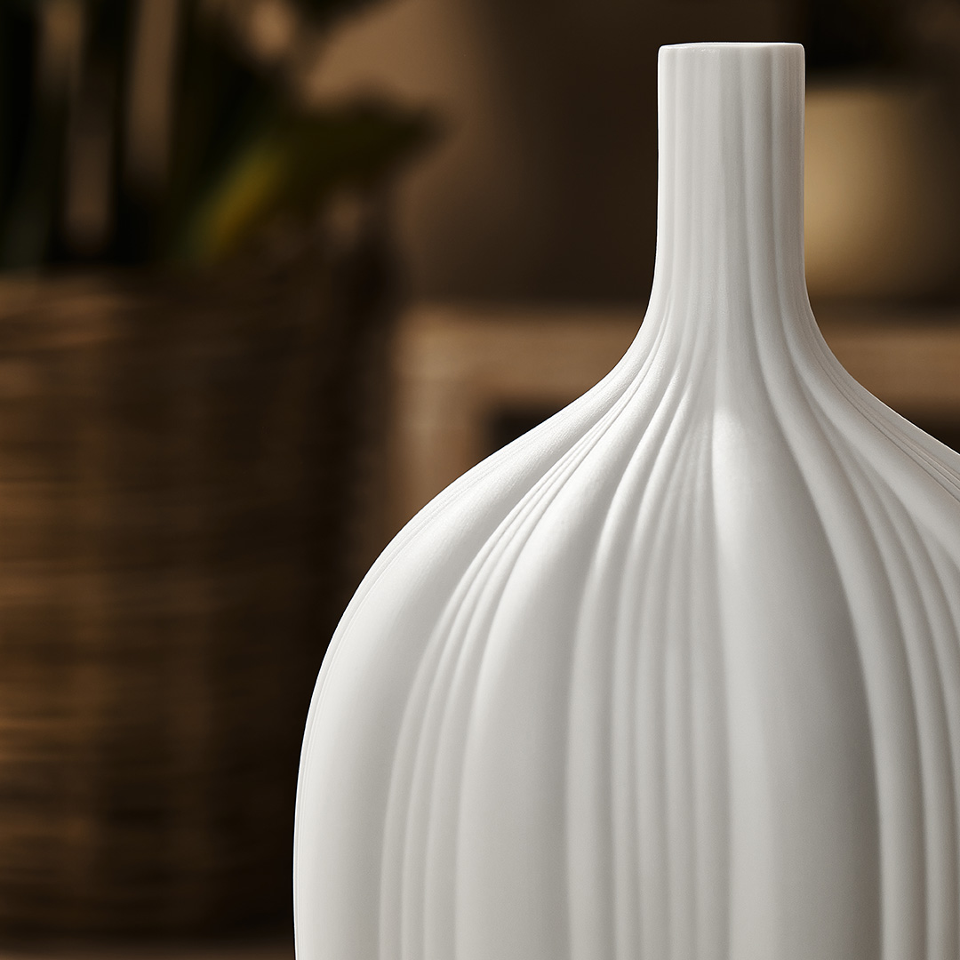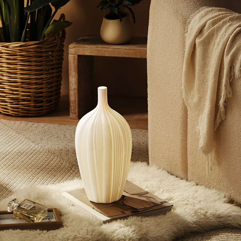 With the narrow opening on the top, the lamp resembles the shape of a vase. The well-proportioned stripes that stretch across the lamp is reminiscent of a flower bud ready to bloom. Light permeates through the ceramic shade, flattering its elegant form, both artistic and unique.