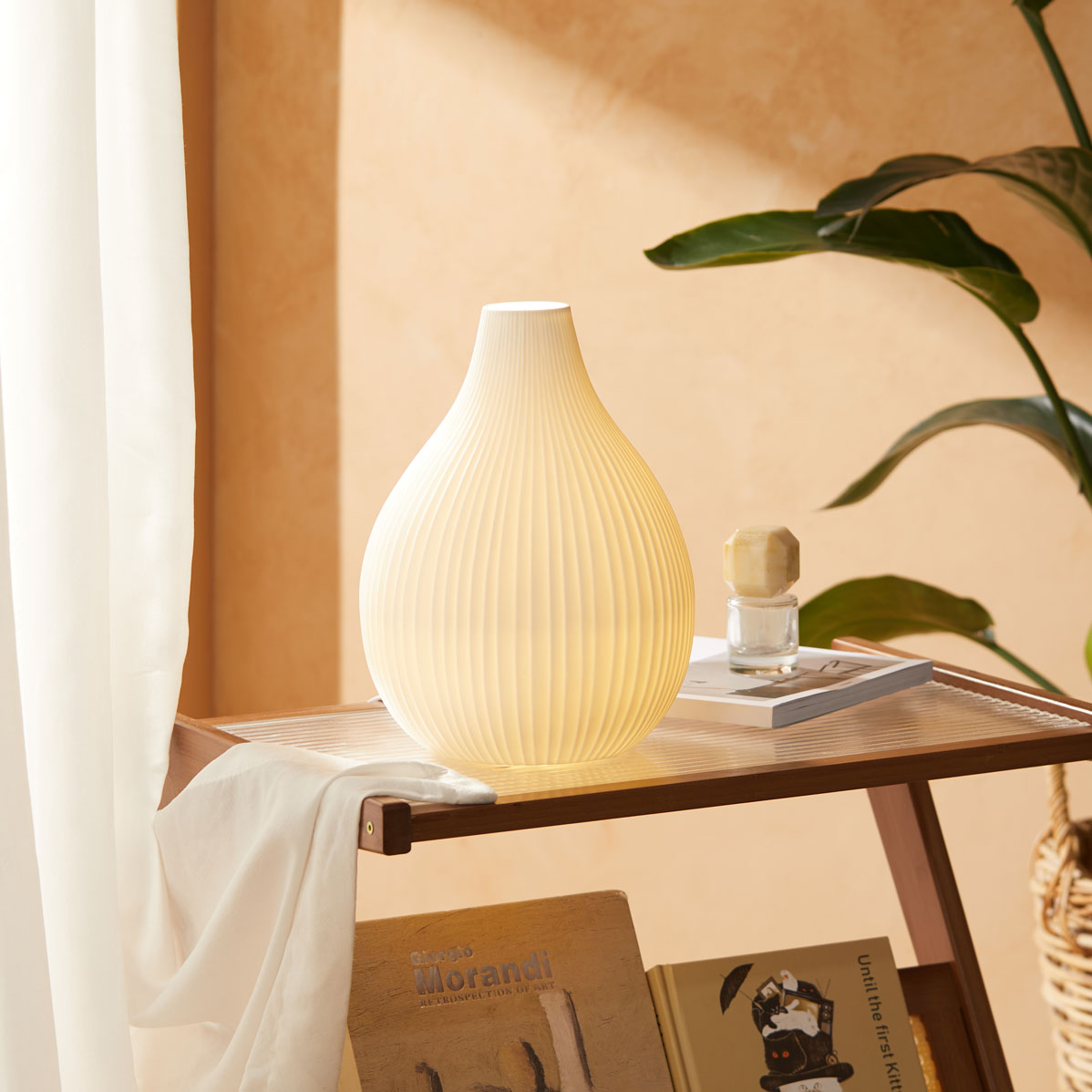 The design featuring an elongated and narrow opening resembles a vintage ceramic vase, and blends into various styles of home decor. Every lamp is hand-carved and painted to ensure that no two lamps are alike.