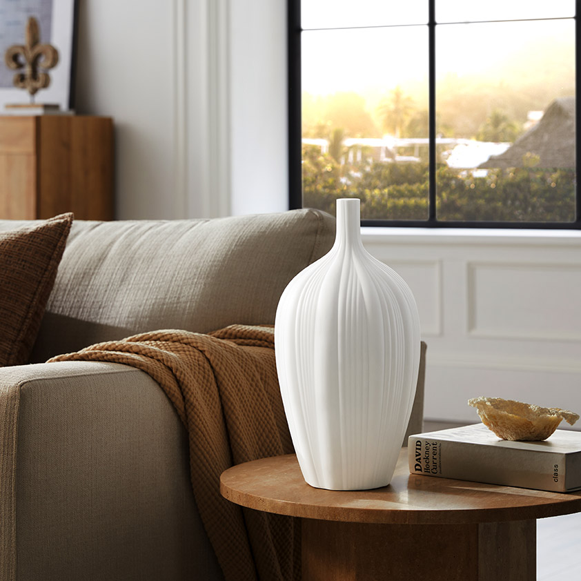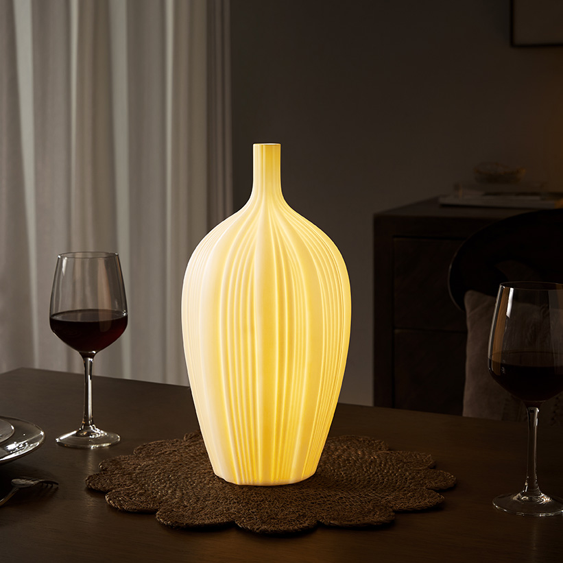 With the narrow opening on the top, the lamp resembles the shape of a vase. The well-proportioned stripes that stretch across the lamp is reminiscent of a flower bud ready to bloom. Light permeates through the ceramic shade, flattering its elegant form, both artistic and unique.