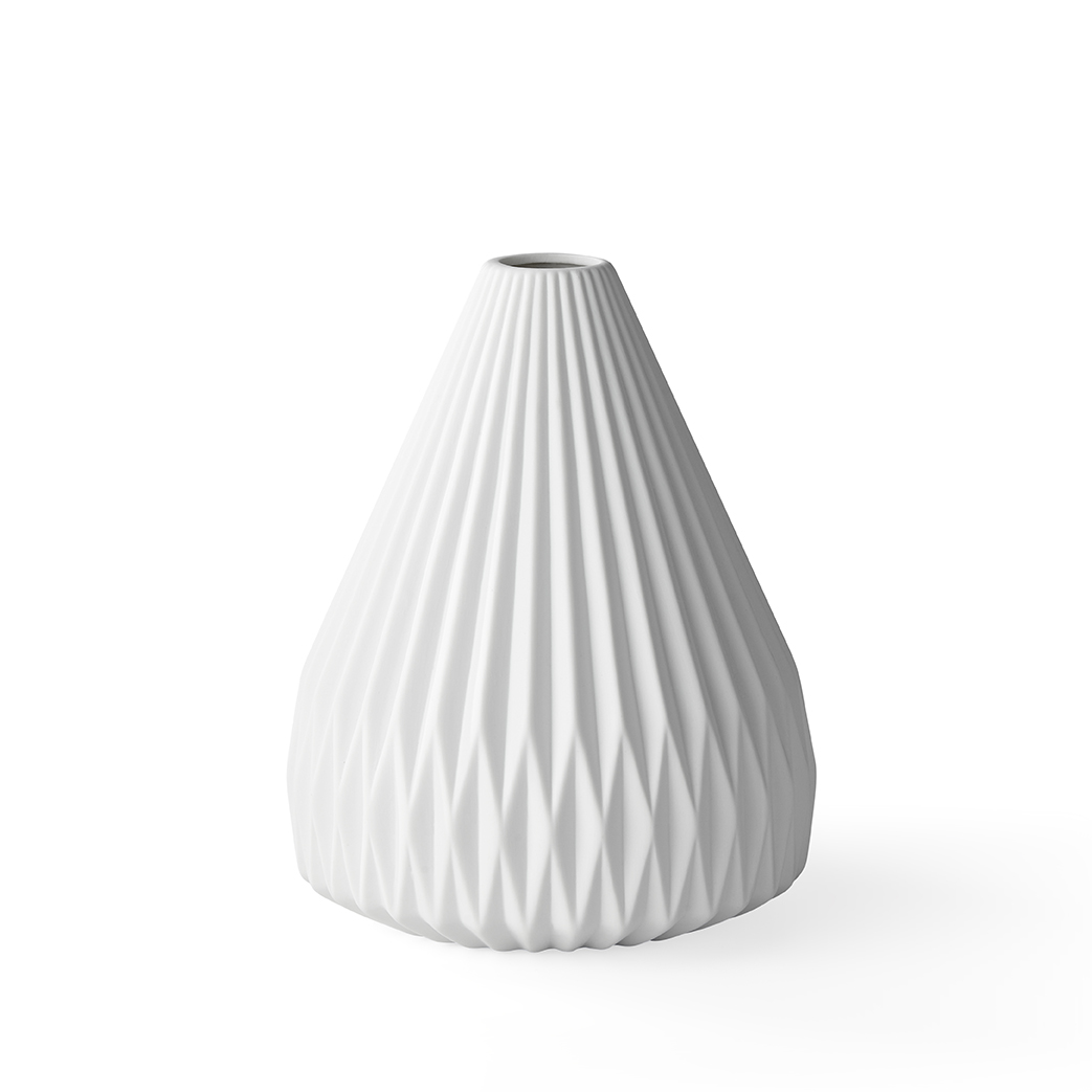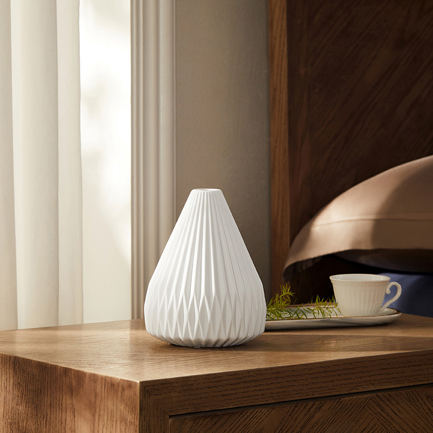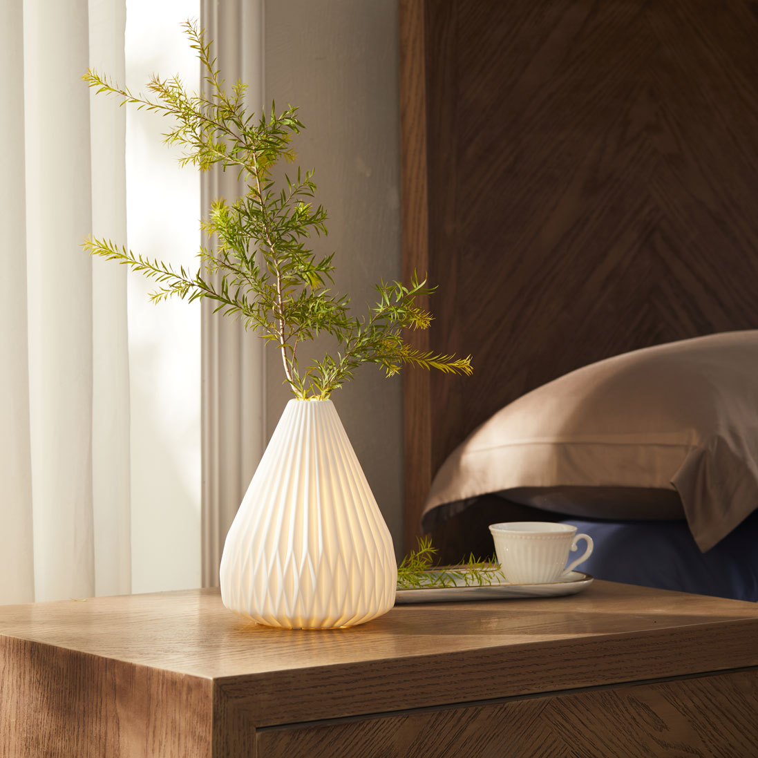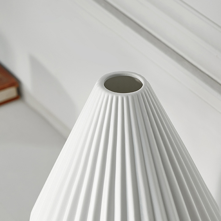 This futuristic table lamp in the form of an inverted cone breaks the convention of a table lamp. Its interlacing textures introduce visual fluidity, simplicity and style. The lamp body is meticulously crafted with unique high-fire porcelain. In the overflowing light, the lamp leaves a unique and delicate silhouette that captures the eye.