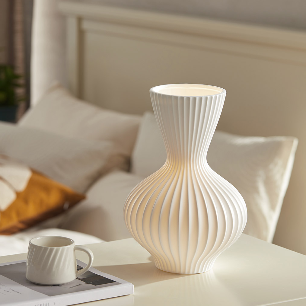 The design of this table lamp is inspired by the vase in "Bouquet of Wildflowers" a masterpiece of the French Impressionist painter Édouard Manet. The shape of the lamp features a rounded base and a wide mouth at the top, replicating the elegant form of the vase and evoking a sense of classic European nostalgia. Flowing from the mouth of the vase, the light extends upward and gently diffuses. The designer skillfully incorporates the minimalist vertical stripe design elements into the classic silhouette of the lamp, which add a smooth-flowing and rhythmic vibe to it, paying homage to classical art while also sprinkling a sense of modern dynamism.