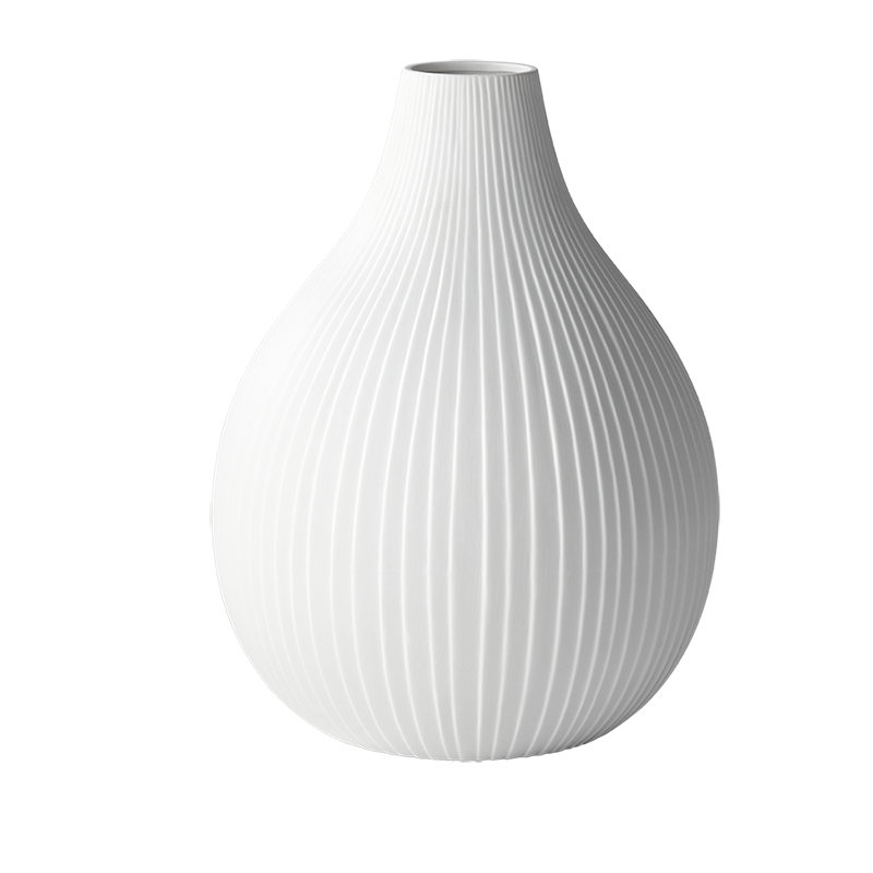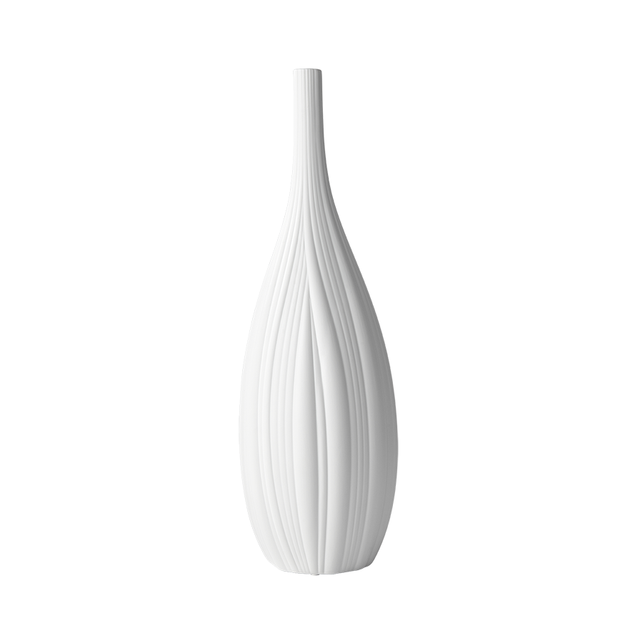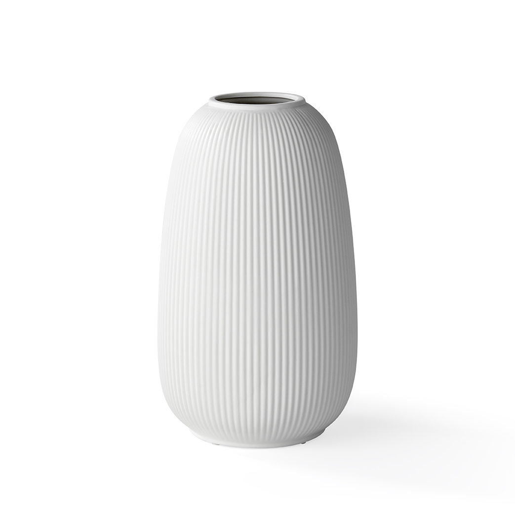 takes the form of a pure white cylinder with delicately engraved vertical carvings.