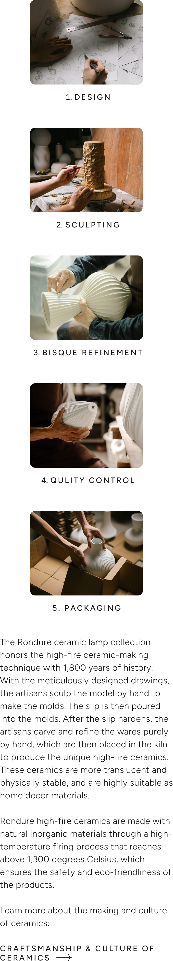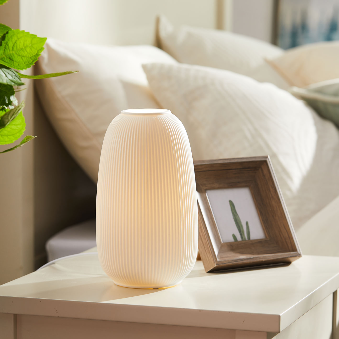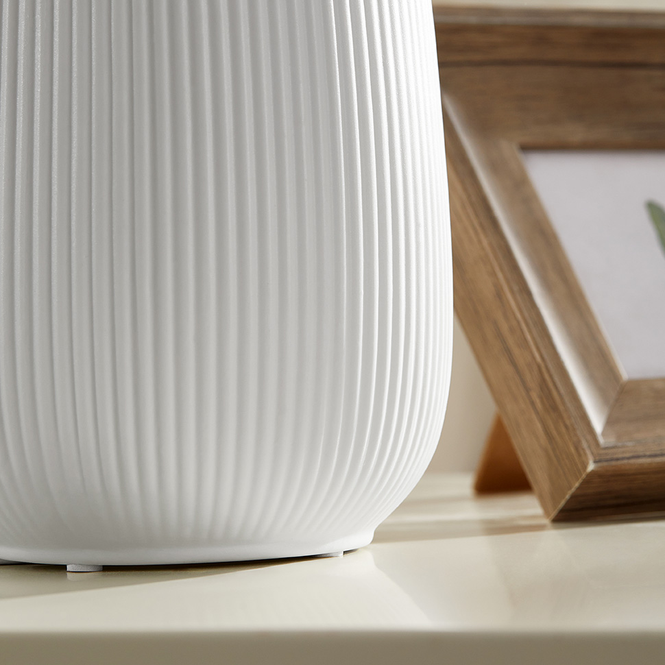 This modernistic and simplistic ceramic lamp, inspired by minimalist aesthetics, takes the form of a pure white cylinder with delicately engraved vertical carvings. The textures enhance the lamp’s visual nuance, merging unpretentiousness and artistry in an organic whole. Shining through the body of the high-fire ceramics, the gentle and tranquil light soothes the domestic atmosphere and brings you peace of heart.